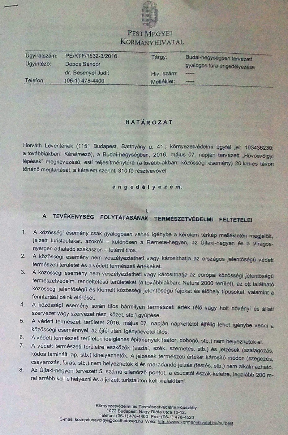 A Pest Megyei Kormányhivatal Környezetvédelmi és Természetvédelmi Főosztály természetvédelmi engedélye (2016.)